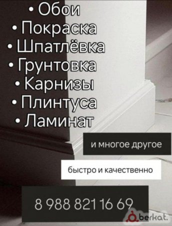 Ремонт квартир любой сложности • Шпаклёвка • Грунтовка • Обои • Карнизы • Плинтуса и многое другое ! Писать на WA +79888211669 Быстро и качественно !